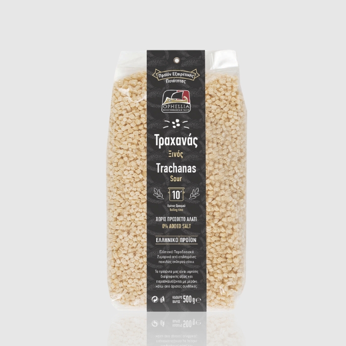 Ophellia sour trahanas is made with a traditional recipe from sheep’s milk and wheat, offering the distinctive spicy, sour taste that sets it apart. Nutritious and filling, it is ideal for hot soups, traditional baked dishes or even as a base for creative recipes.